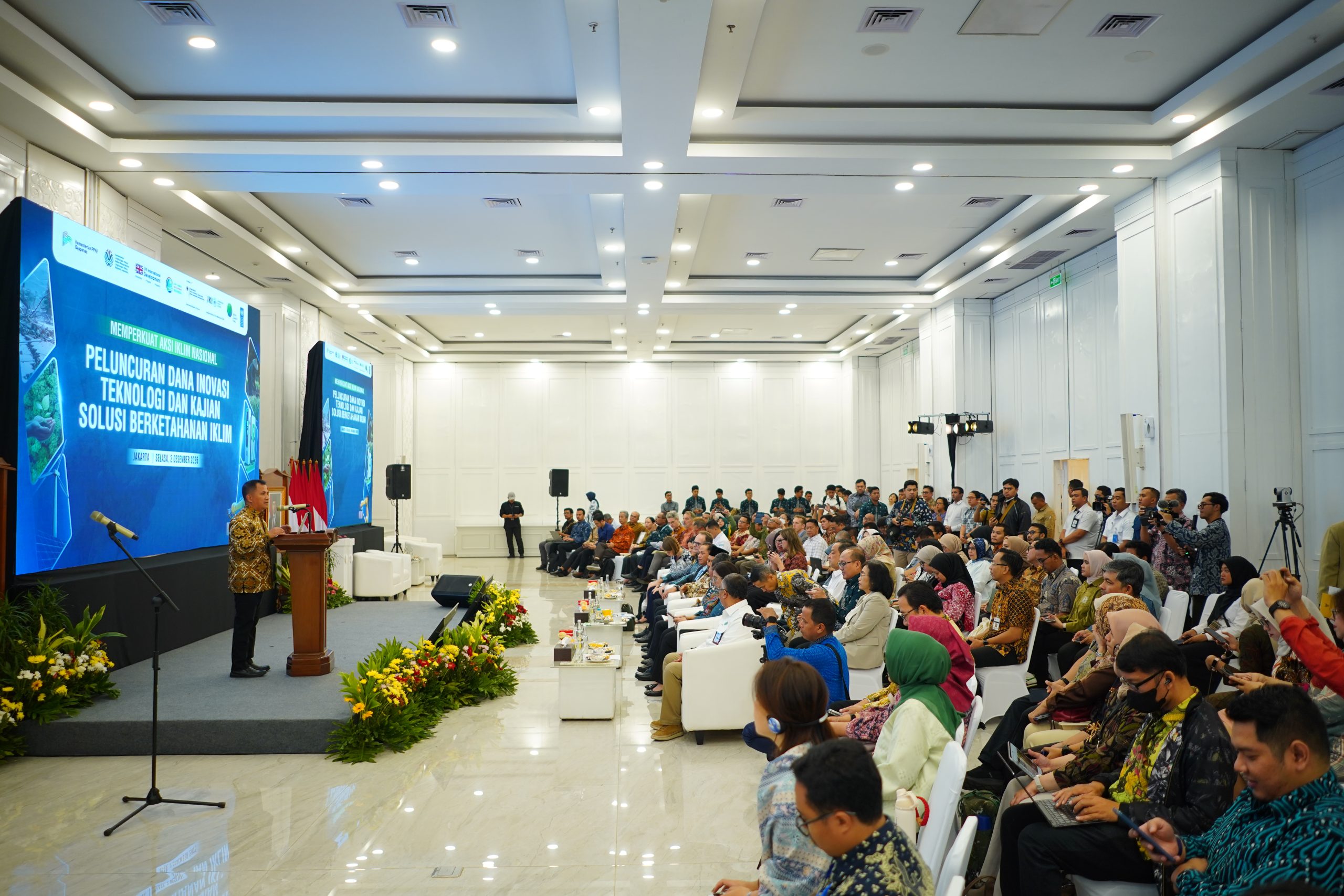 JAKARTA – Pemerintah Indonesia menegaskan komitmen bertransformasi menuju ekonomi hijau dan berketahanan iklim sebagai upaya menghadapi krisis iklim melalui peluncuran Innovation and Technology Fund (ITF), serta Pembaruan Dokumen Kebijakan Pembangunan Berketahanan Iklim (PBI) 2.0 dan Kajian Awal Dampak Perubahan Iklim terhadap Perpindahan Penduduk di Wilayah Pesisir dan Pulau-Pulau Kecil di Jakarta, Selasa (2/12). “Apa yang kita lakukan hari ini merupakan penegasan arah besar pembangunan nasional Indonesia ke depan. Ini adalah sinyal kuat bahwa kita harus mempercepat langkah, karena setiap keterlambatan akan dibayar dengan biaya sosial dan ekonomi yang semakin besar,” tegas Menteri PPN/Kepala Bappenas Rachmat Pambudy dalam acara yang turut dihadiri Menteri Lingkungan Hidup Hanif Faisol Nurofiq, Menteri Kelautan dan Perikanan Sakti Wahyu Trenggono.