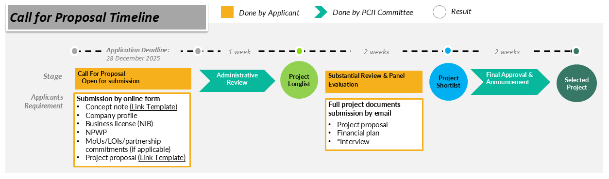 Eligible applicants are entities legally registered in Indonesia and operating in at least one of the PCII thematic focus areas. Foreign companies may apply through a local subsidiary, joint venture, or MoU with an eligible Indonesian partner. All applicants must meet the mandatory eligibility criteria.