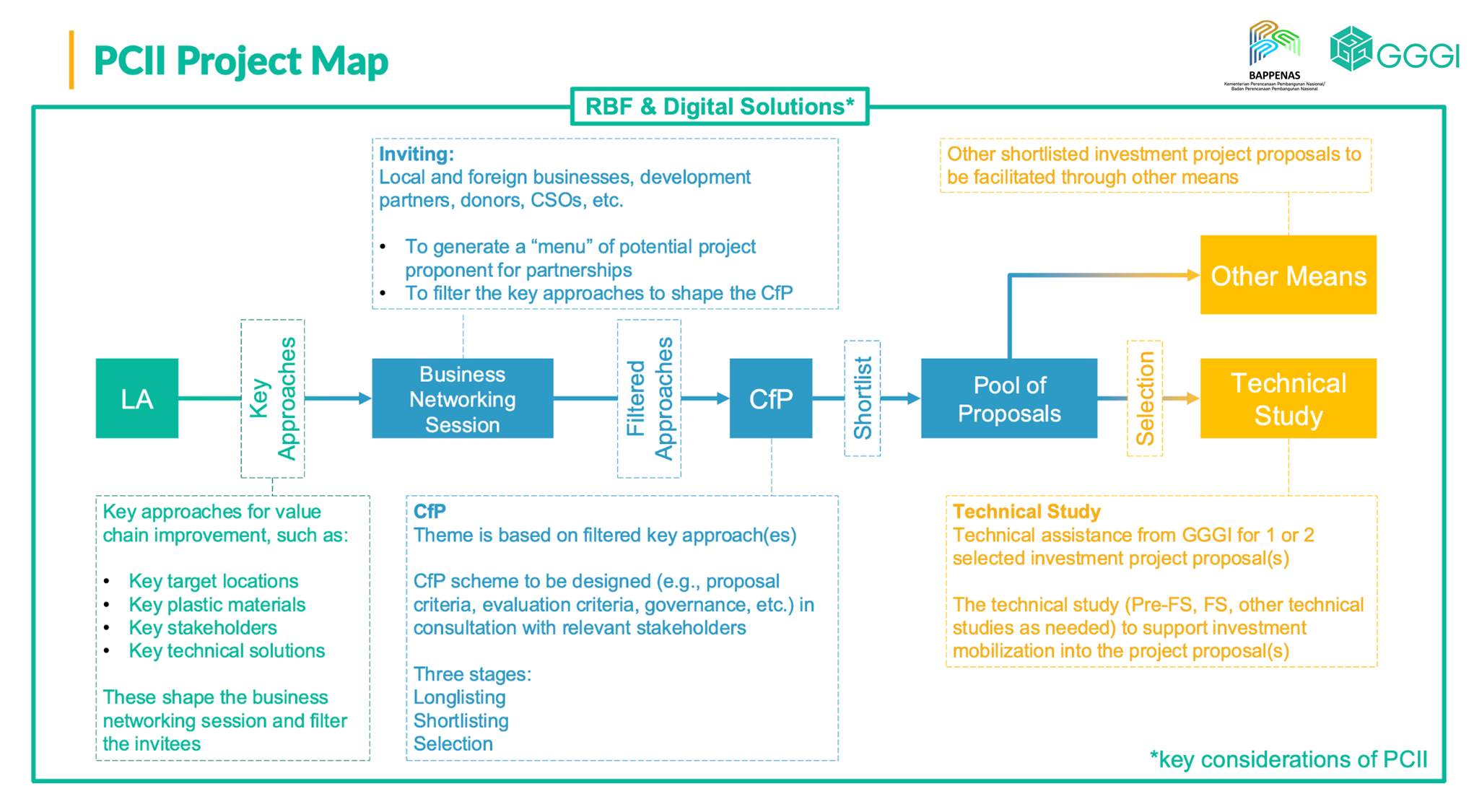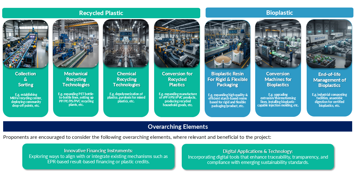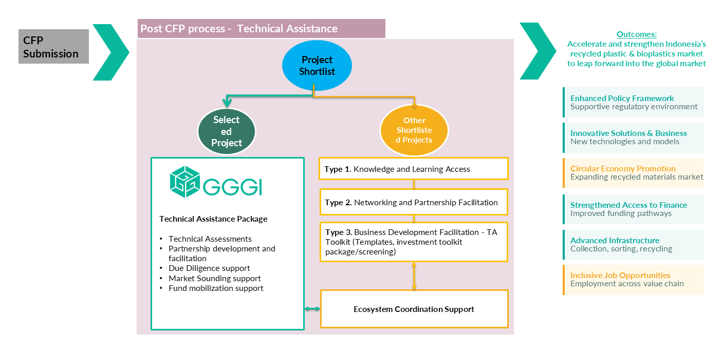 The main objective of the Call for Proposals (CfP) is to identify investment-ready projects that can drive the development of a sustainable plastic value chain in Indonesia. In addition, the CfP seeks to support potential projects—particularly those led by medium-sized players—to advance toward investment readiness through targeted technical assistance, such as technical assessments and business development support.