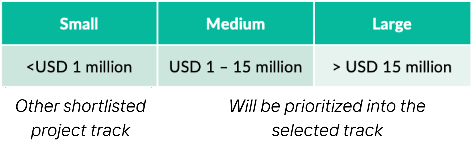 All submitted applications will be categorized based on the investment scale categories shown in the table below. Only proposals in the Medium and Large categories will be prioritized for assessment under the selected project/winner track, while proposals in the Small category will still be accepted and supported by being connected to appropriate technical assistance programs.