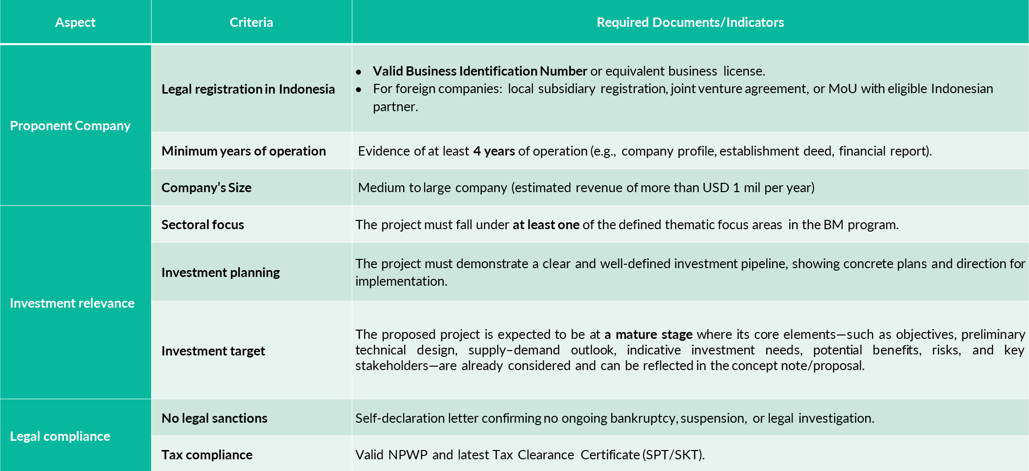At the initial administrative stage, applicants must submit a concept note using the provided template, a company profile, and proof of legal registration through a valid NIB and NPWP. These four documents represent the minimum mandatory requirements to proceed to the next stage. Applicants may also include additional materials—such as partnership MoUs or other administrative certificates—which are not mandatory but may strengthen their submission.